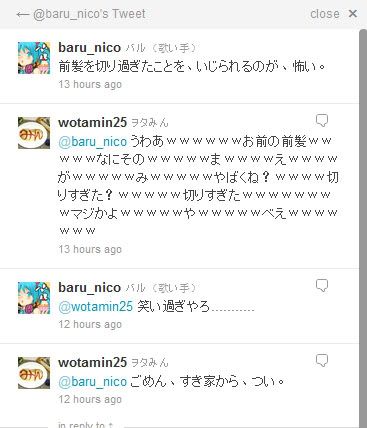 Wotamin: "Uwaa wwwwww your fringe wwwwwwwww what's that wwwwwwwwww f wwwwwwww r wwwwww i wwww n wwwww g wwww e wwwww is it bad? wwwww It's cut too short? wwwww It's cut too short wwwwww Are you serious wwwww oh wwwww noo wwww."